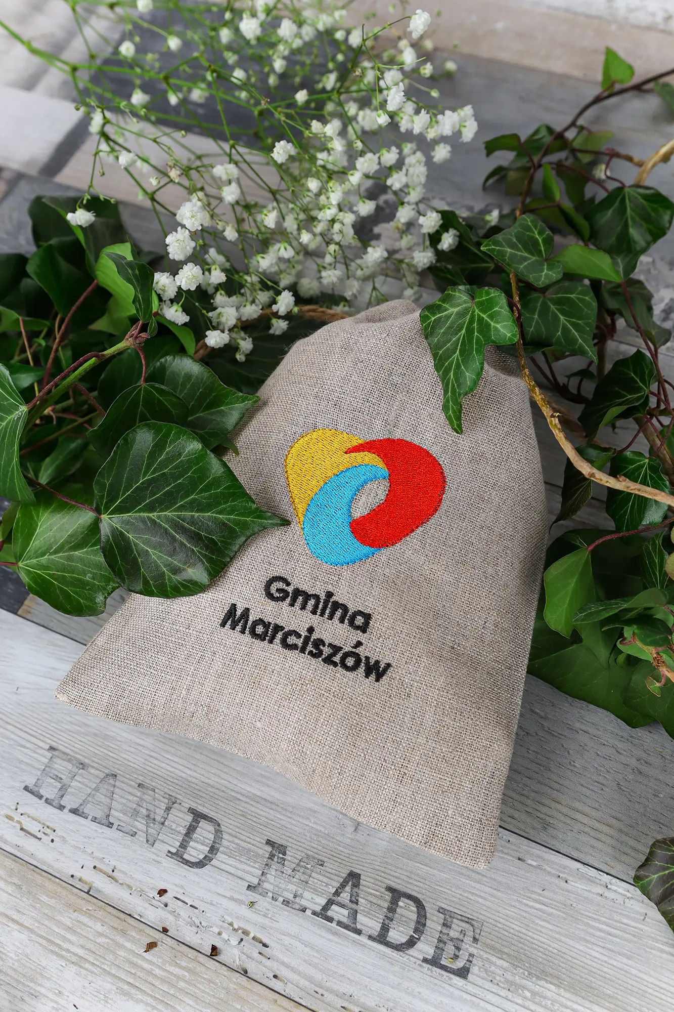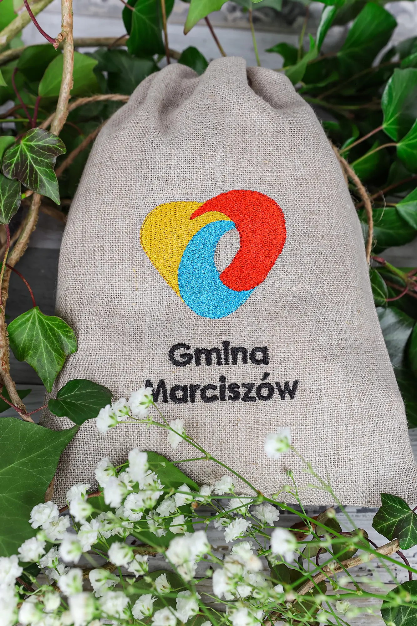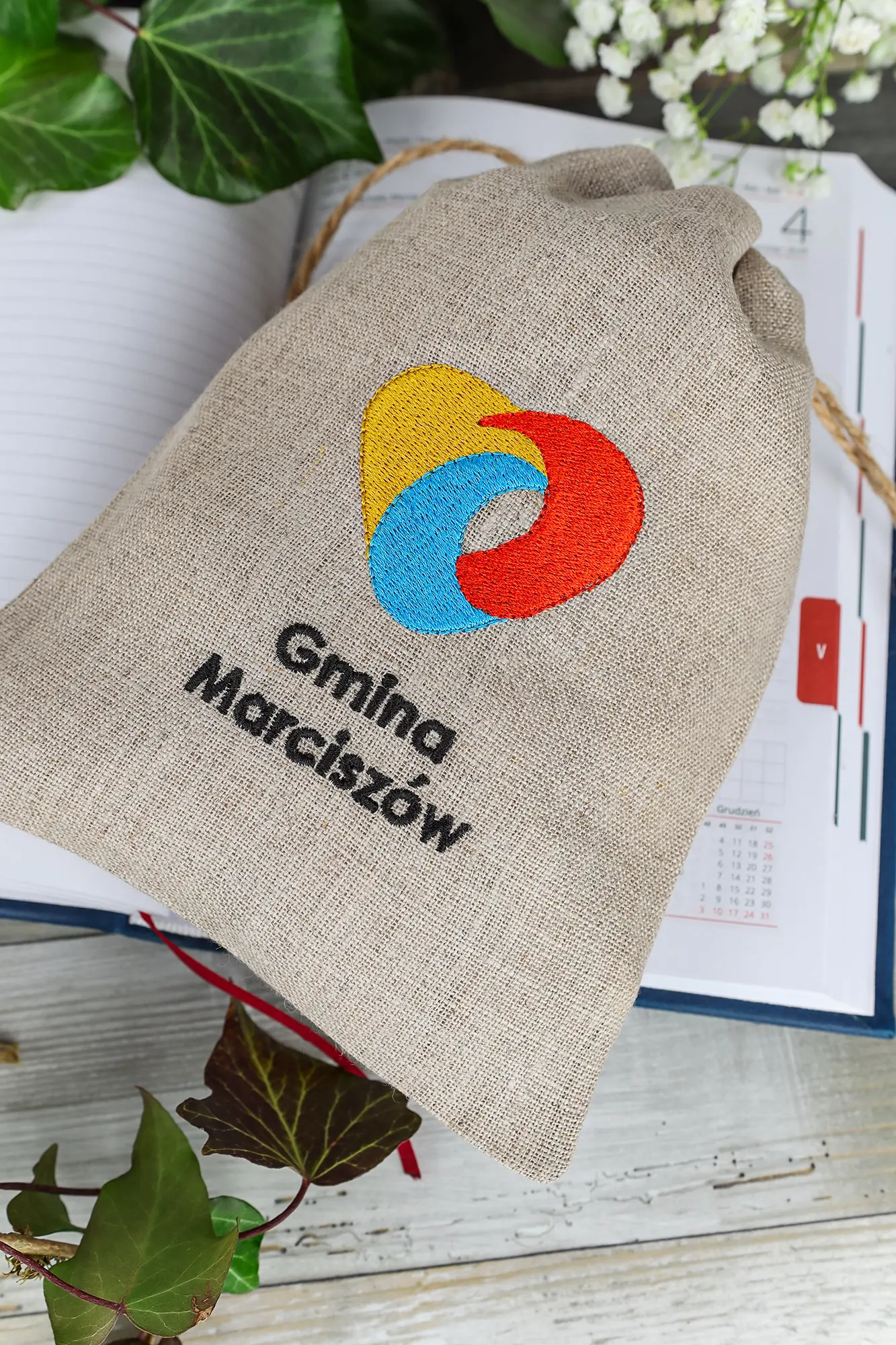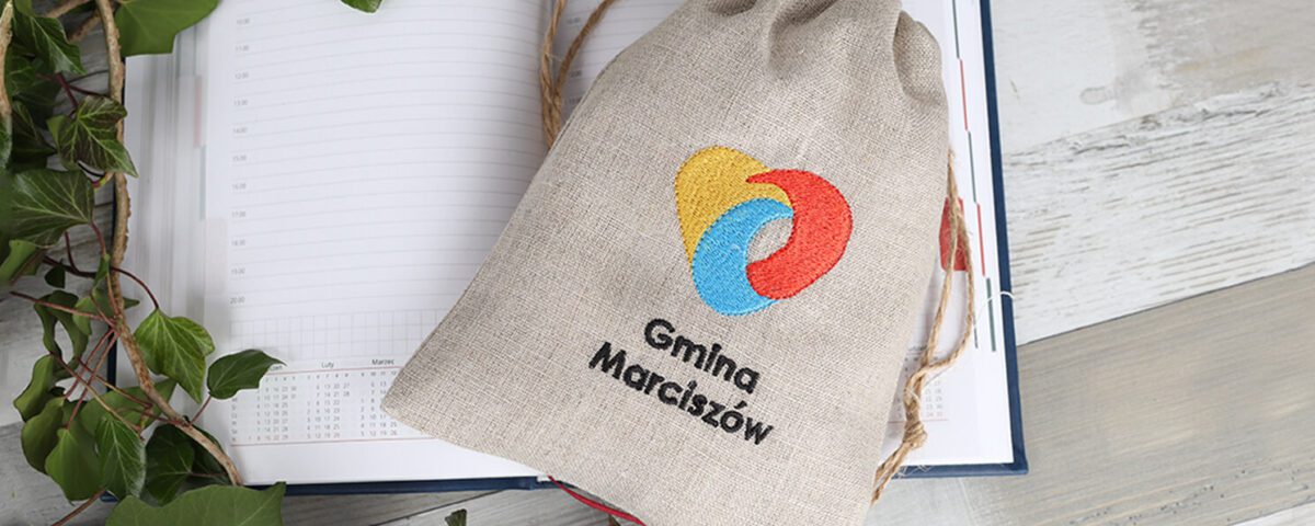 Woreczki z naturalnego lnu ozdobiliśmy haftem nowoczesnego logotypu gminy w pełnym kolorze.