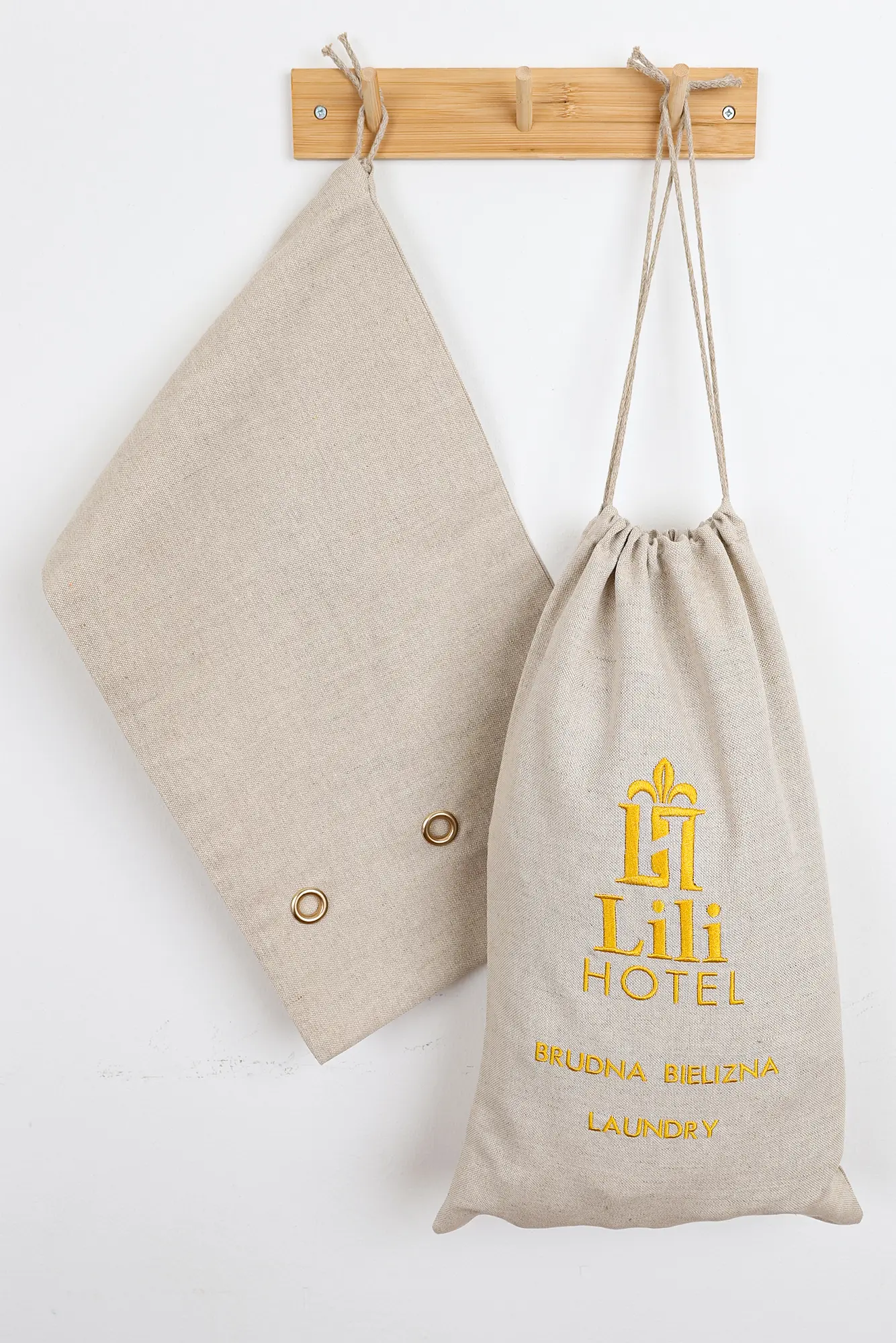 Lniane, wentylowane worki dla hotelu Bel Mon Resort to ekologiczne wyroby dla horeca. Te worki na bieliznę wykonane z lnu o gramaturze 280g/m², posiadają otwory wentylacyjne i haftowane logo. Worki lniane z logo pomagają w przechowywaniu brudnej bielizny, eliminując nieprzyjemne zapachy i zapewniając higienę. Materiałowe worki dla hoteli, znakowane worki, to polska produkcja promująca zrównoważony rozwój, poprawiając wizerunek hotelu i zadowolenie gości.