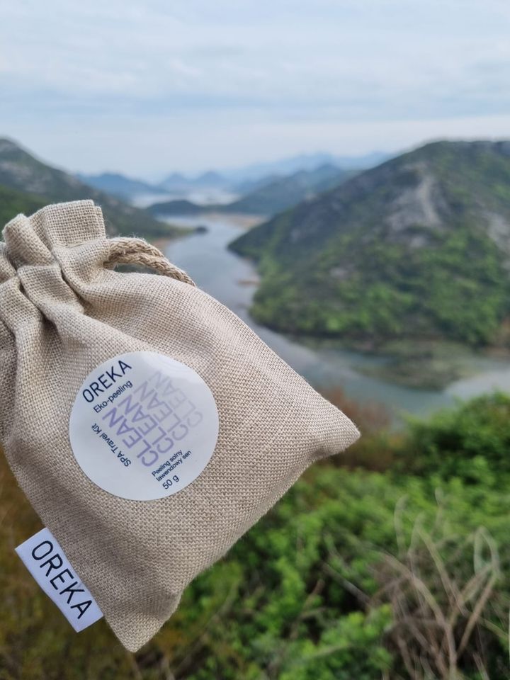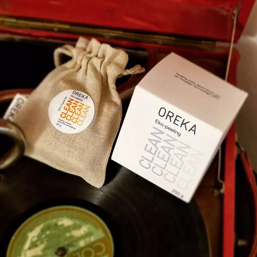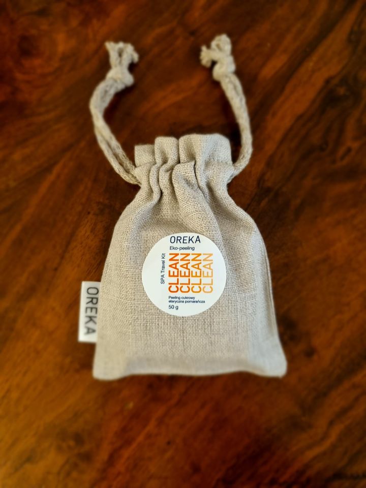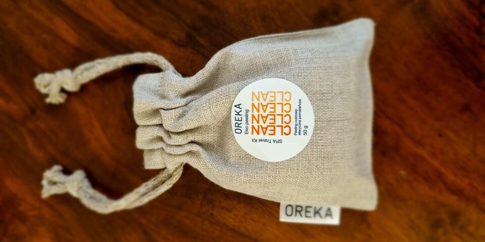 • lniane woreczki z wszytą metką satynową z logotypem marki OREKA oraz ze sznurkiem bawełnianym; przeznaczone do przechowywania kosmetyków naturalnych.