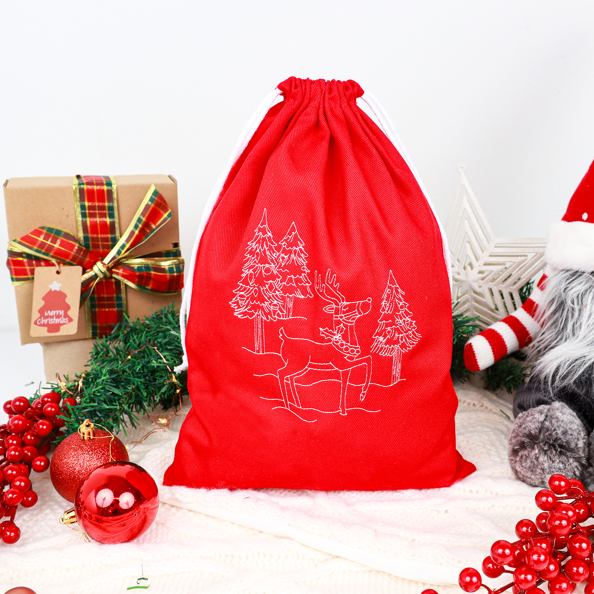 Bawełniany czerwony worek na prezent świąteczny – Rudolf
