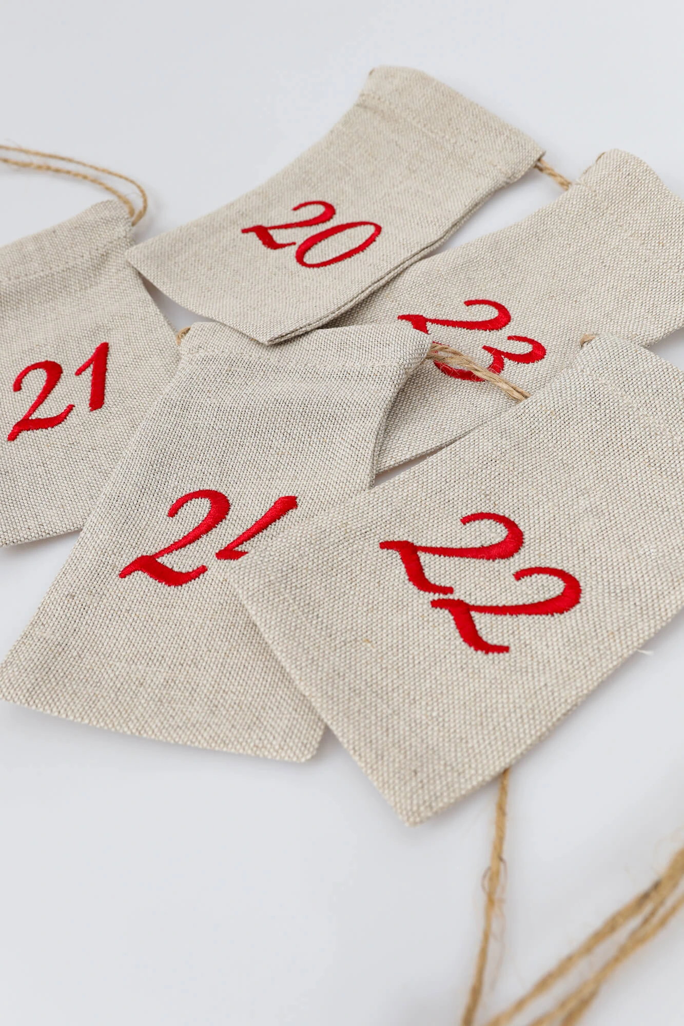 Zestaw lnianych woreczków z haftowanymi numerami to idealna baza do stworzenia własnego, rodzinnego kalendarza adwentowego.
