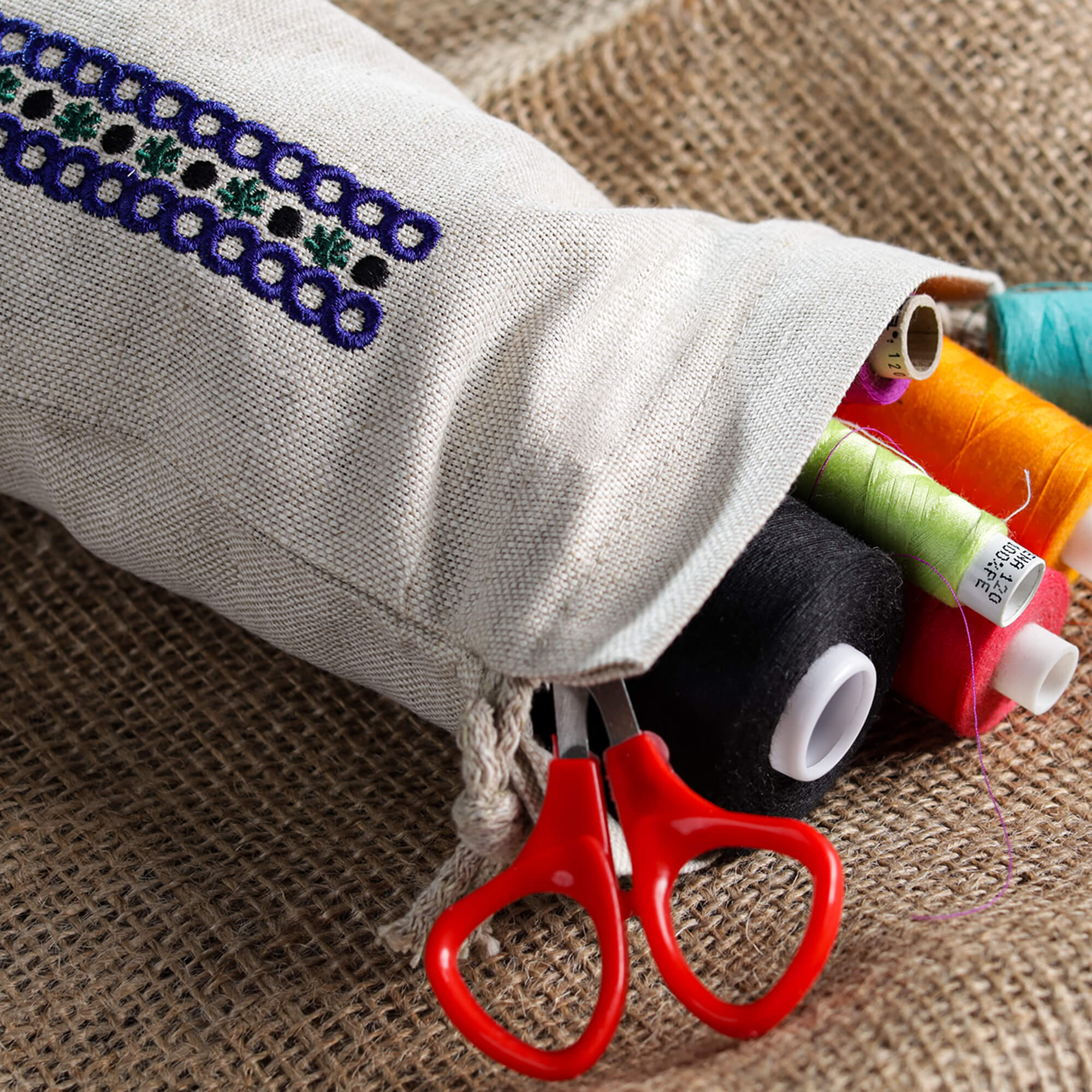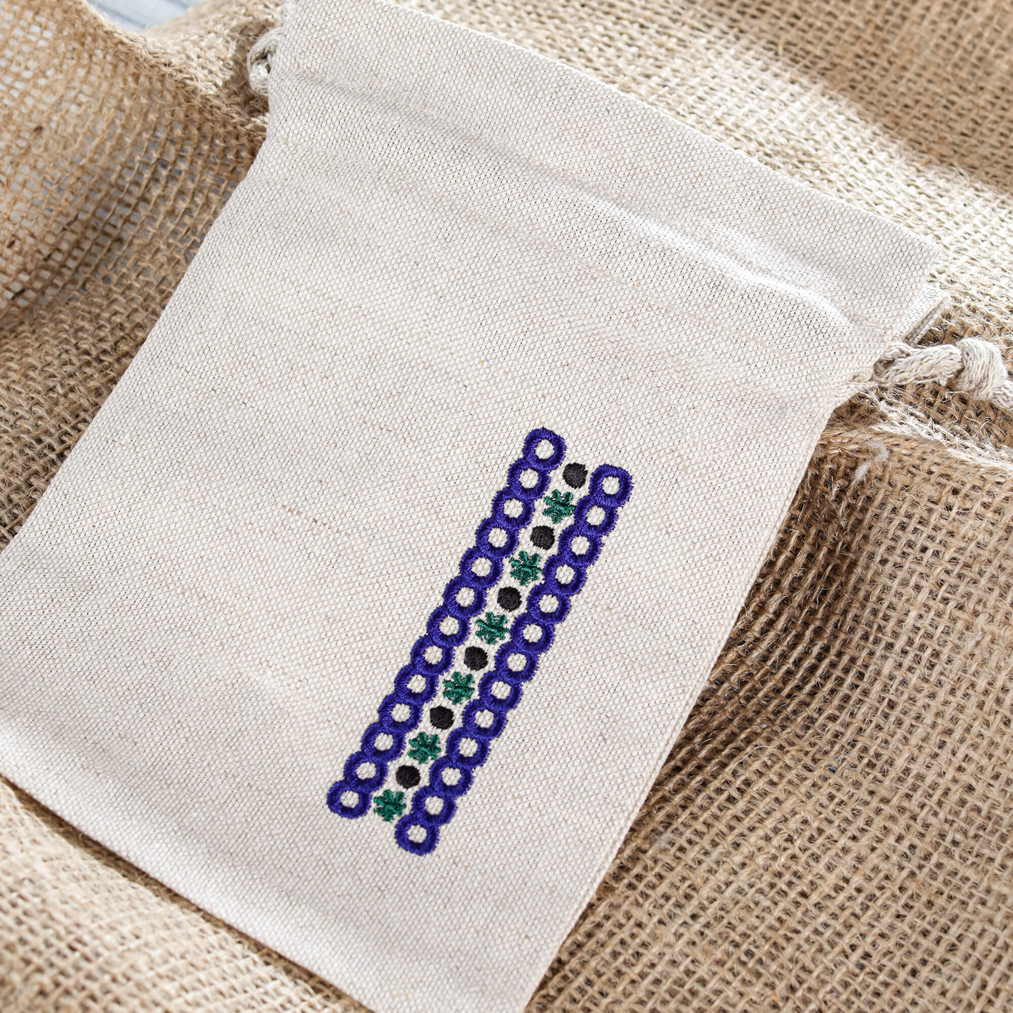 Lniany woreczek dekoracyjny z haftem ludowym – inspirowany ceramiką bolesławiecką