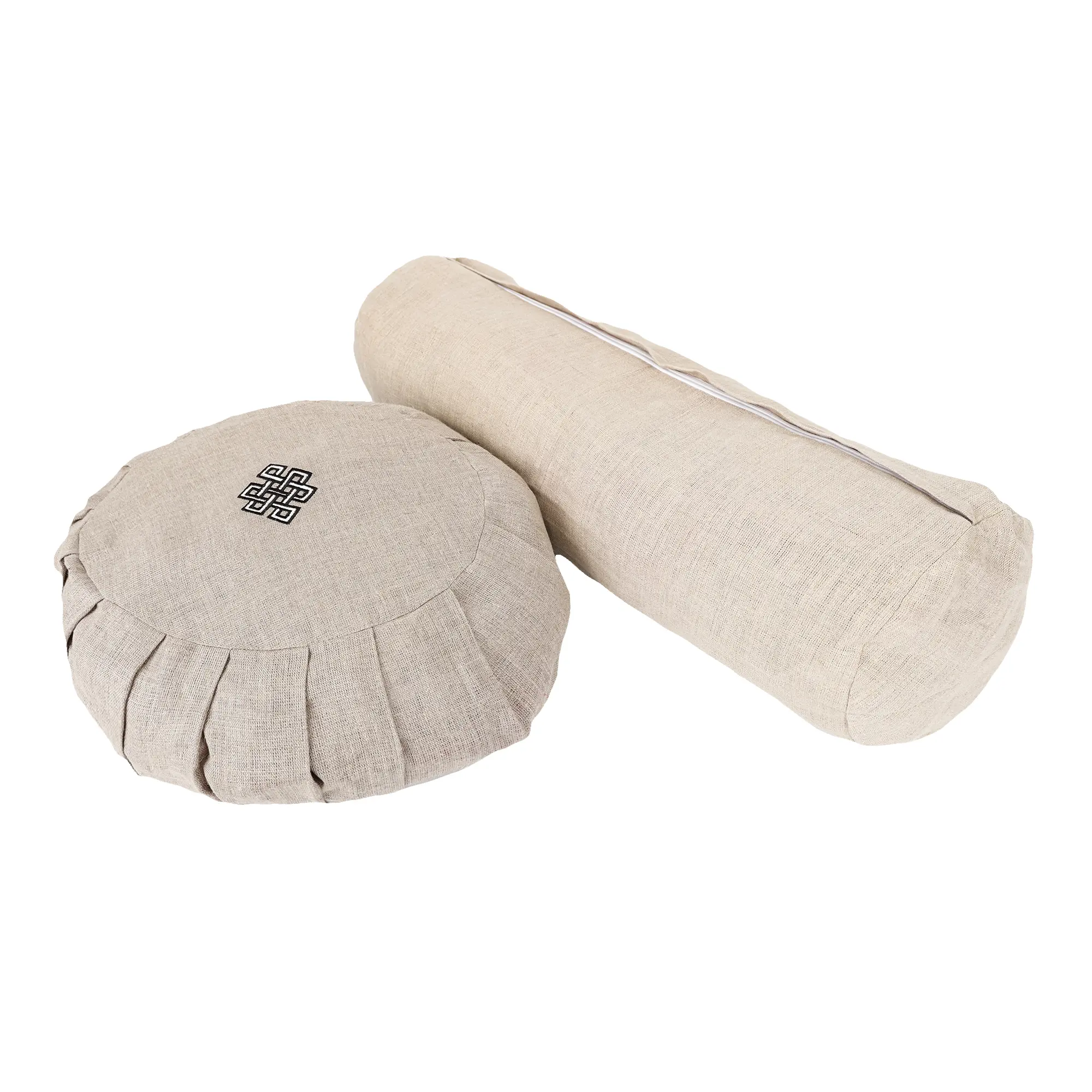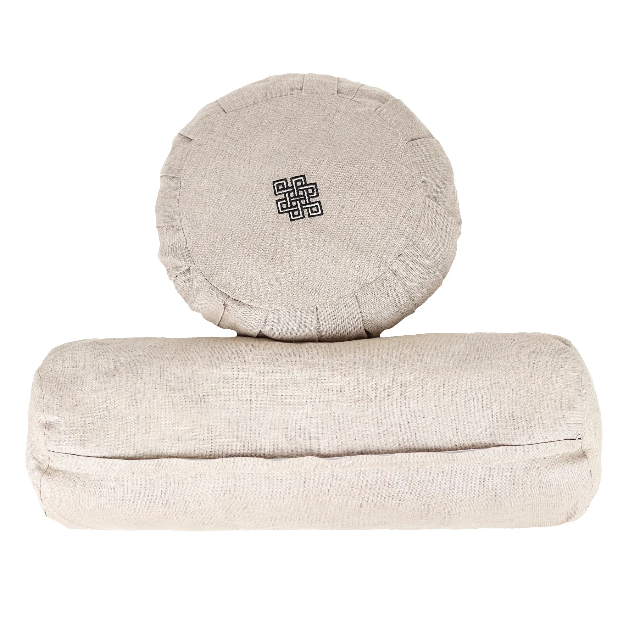 • Poduszka do Medytacji (Zafu): również uszyta z lnu, z naturalnym wypełnieniem z łuski gryki, która doskonale dopasowuje się do kształtu ciała. Zapewnia optymalną pozycję podczas medytacji, wspierając kręgosłup i zapobiegając dyskomfortowi.