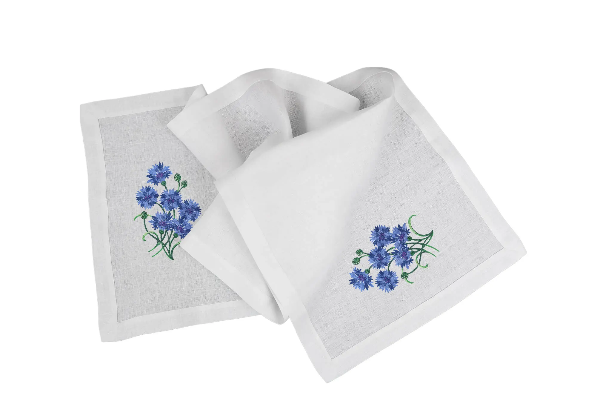 Lniany bieżnik z haftem – chabry – dwa kolory