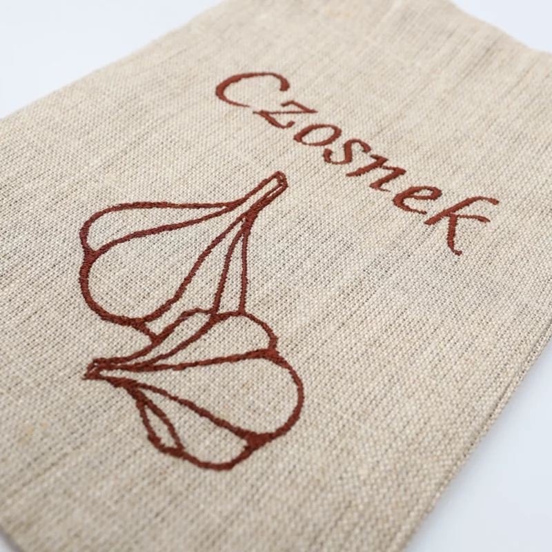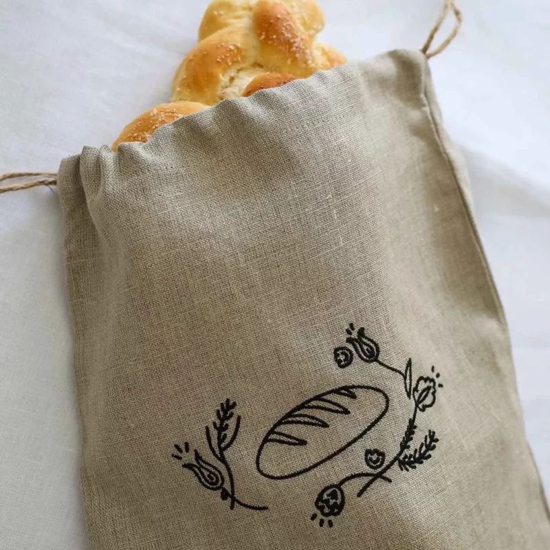 Sakwy uszyte są z grubego, wysokogatunkowego lnu, ozdobione haftem (do wyboru) i zamykane – dzięki temu można w nich wygodnie przechowywać chleb lub bułki, ale też ustawić je bezpośrednio na stole jako estetyczny koszyczek.